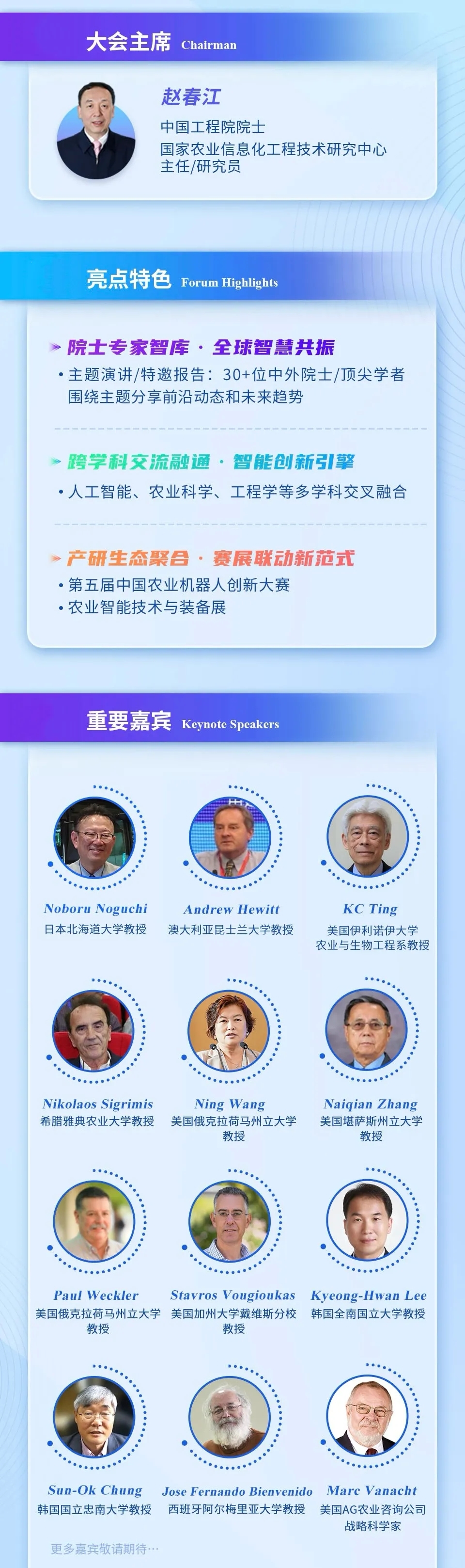 本次会议将聚焦农业传感器、农业遥感探测、农业人工智能与大模型、农业机器人与智能装备、智慧农场建设实践等主题,邀请国内外专家学者分享最新的技术研究成果和应用经验。旨在通过加强智慧农业领域学术界、产业界、政府部门和用户的深入合作与交流,共同推动智慧农业的创新发展。